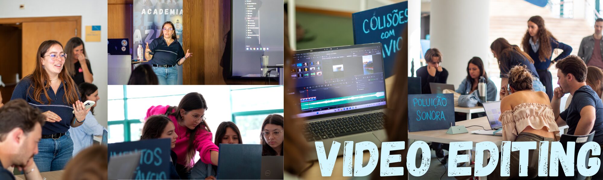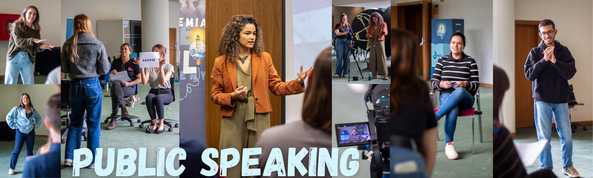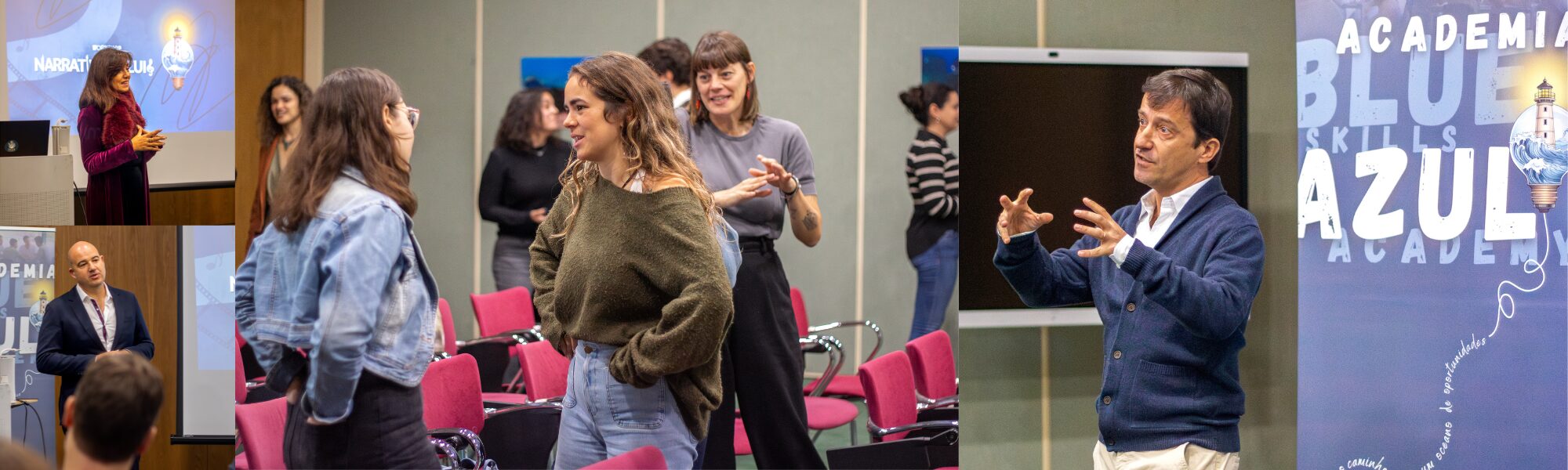 Para nós, um dos momentos mais marcantes do Workshop de Narrativas Azuis foi ver todos os participantes enfrentarem as suas incertezas e mergulharem na nossa atividade de falar em público com entusiasmo. Desafiámos os participantes a apresentar perante um grupo sem preparação, a responder a perguntas num falso painel de entrevista e a apresentar notícias falsas para uma câmara. O objetivo de tudo isto foi destacar boas práticas de comunicação em público (nomeadamente, que a emoção é tão importante — se não mais importante — do que as palavras, e que é importante ser breve!), bem como ajudar a enfrentar um medo comum de forma divertida.